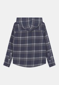 Camisa de franela con capucha de color azul marino con patrón de cuadros en gris y beige, botones al frente, mangas largas y un bolsillo en el pecho etiquetado con una pequeña etiqueta.