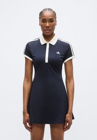 Vestido tipo polo azul marino con mangas cortas, cuello blanco y tapeta con tres botones. Presenta rayas blancas en los hombros y un logo en el pecho.