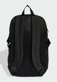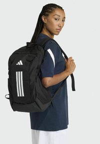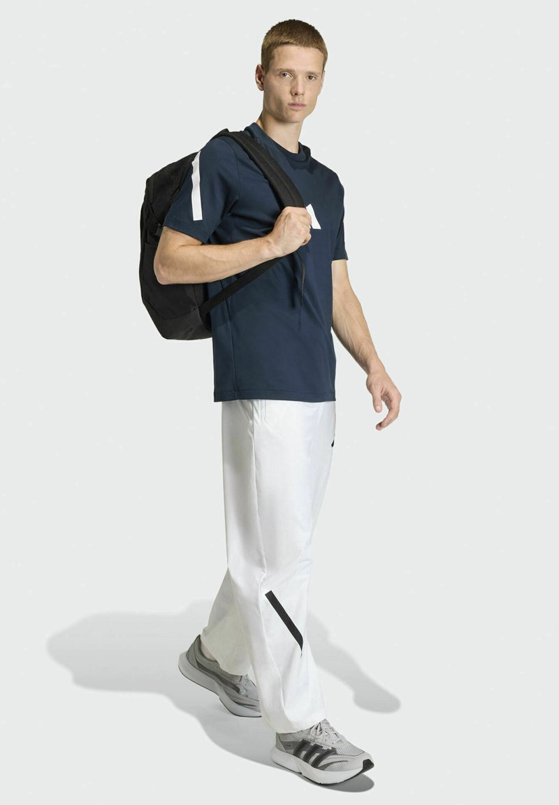 Joven caminando con una camisa azul marino, pantalones blancos con detalles negros, zapatillas grises y llevando una mochila negra colgada de un hombro.