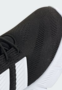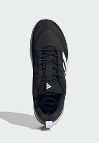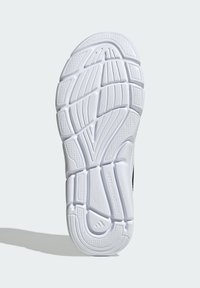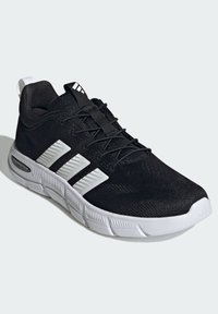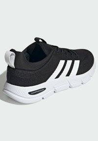 Zapatillas deportivas negras hechas de material de malla, con acentos blancos y tres rayas en el lateral, con una suela flexible etiquetada como "CLOUDFOAM FLEX".
