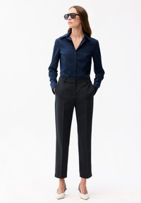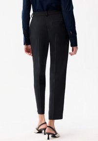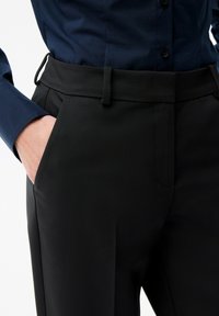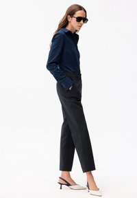 Persona con pantalones negros a medida con bolsillos y zapatos de tacón bajo tipo slingback en blanco y negro, de pie contra un fondo blanco.