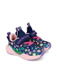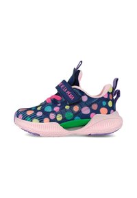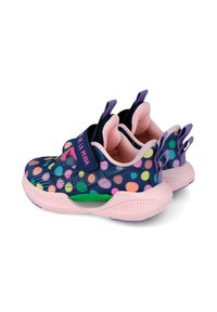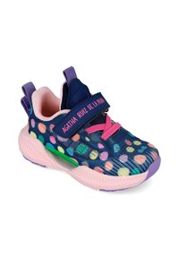 Zapatillas infantiles coloridas con parte superior de malla azul marino y lunares multicolores, detalles en rosa y una correa de velcro. Diseño ligero y flexible.