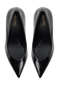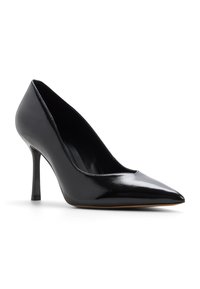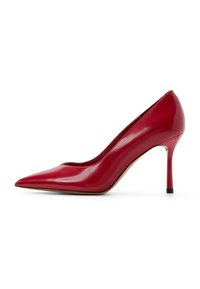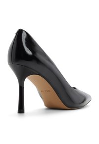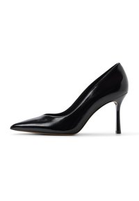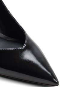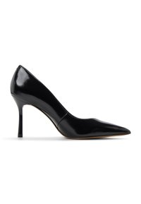 Zapato de salón de charol negro con tacón de aguja alto y punta puntiaguda, mostrado de perfil sobre un fondo blanco.