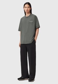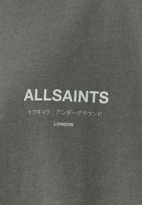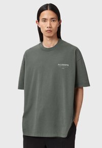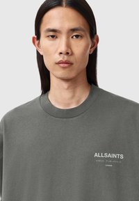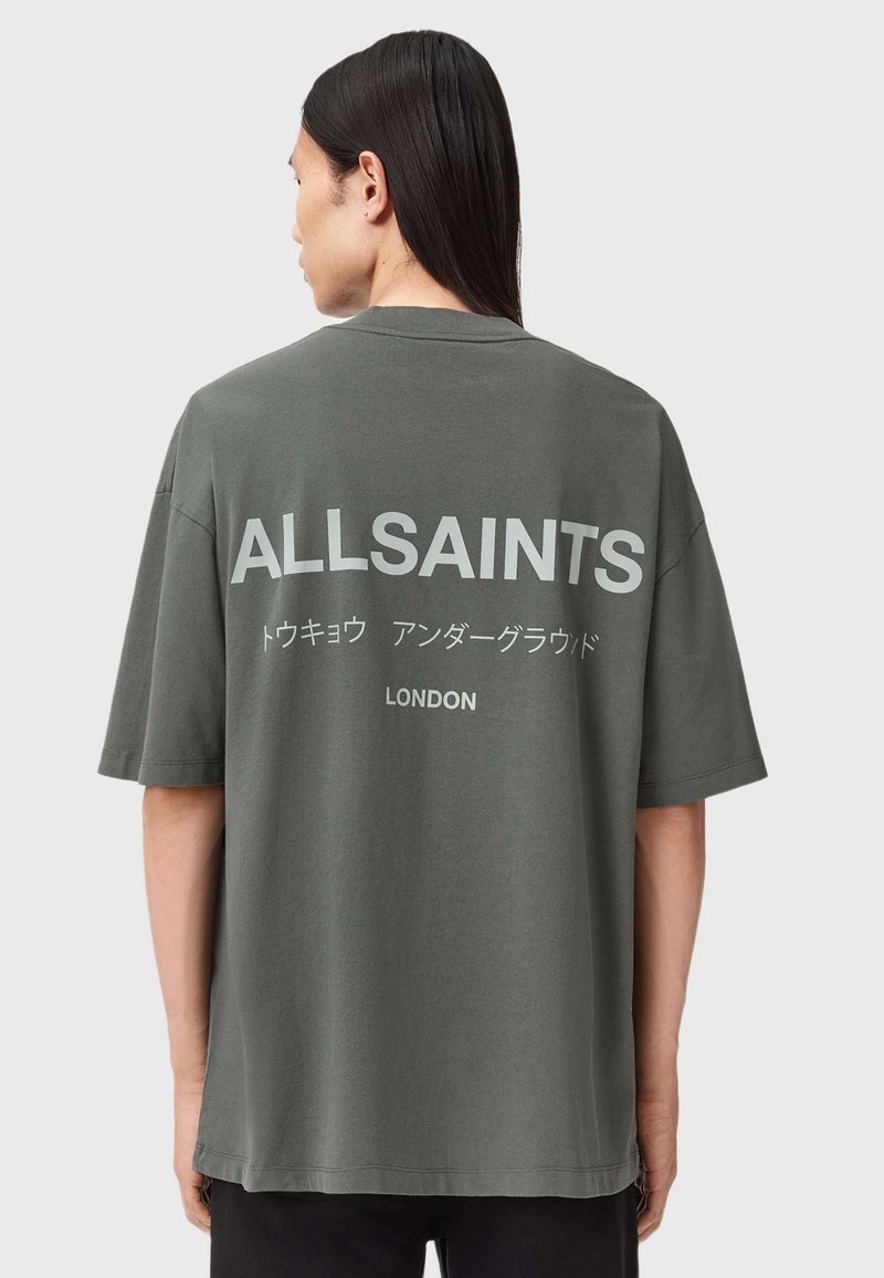 Camiseta gris de gran tamaño hecha de algodón, con un gran texto blanco "ALLSAINTS" y un pequeño texto en japonés en la parte trasera. Mangas cortas, corte relajado.