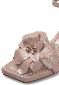 Piernas con sandalias abiertas de color rosa pálido decoradas con grandes flores y correas en el tobillo, combinadas con una falda ligera de volantes con estampado floral.