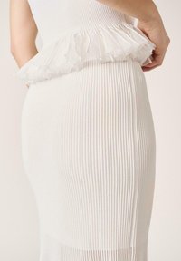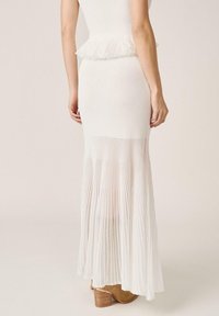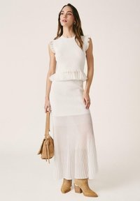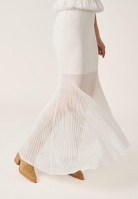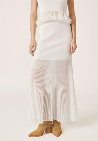 Mujer con una falda larga plisada blanca con detalle de volantes en la cintura, combinada con botines de ante color marrón claro con tacones anchos.