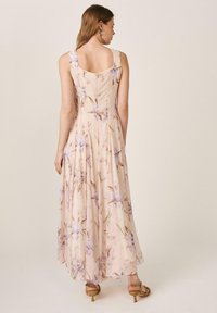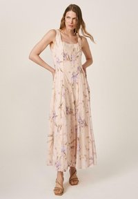Mujer con vestido sin mangas color crema hasta los tobillos con estampado floral morado y sandalias de tacón color tostado, de pie frente a un fondo beige liso.