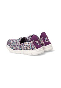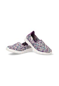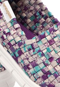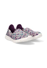 Zapatilla tipo slip-on con parte superior de tela tejida en colores púrpura, verde azulado y blanco, suela blanca flexible, con tirador en el talón y etiqueta de la marca en el lateral.