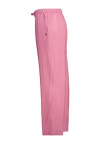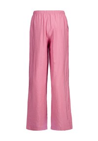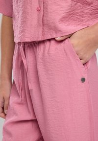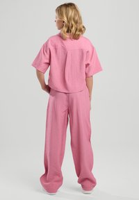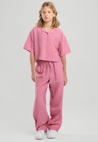 Camisa corta de botón rosa con un bolsillo y pantalones sueltos a juego. La tela tiene un aspecto texturizado y arrugado.