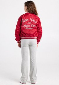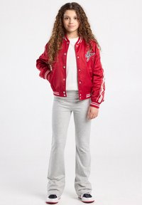 Niña joven con cabello largo y rizado, vistiendo una chaqueta universitaria roja, camiseta blanca, pantalones gris claro y zapatillas negras y blancas, de pie frente a un fondo blanco.