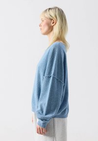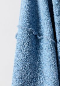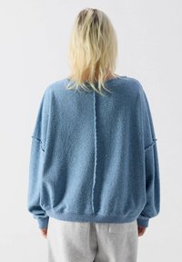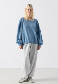 Mujer con un suéter azul claro suelto y texturizado, con hombros caídos y pantalones gris claro, de pie contra un fondo blanco liso.