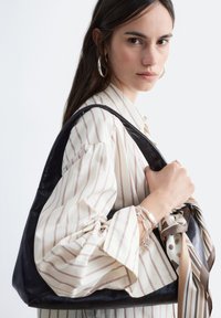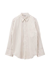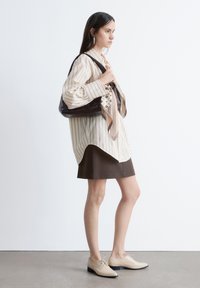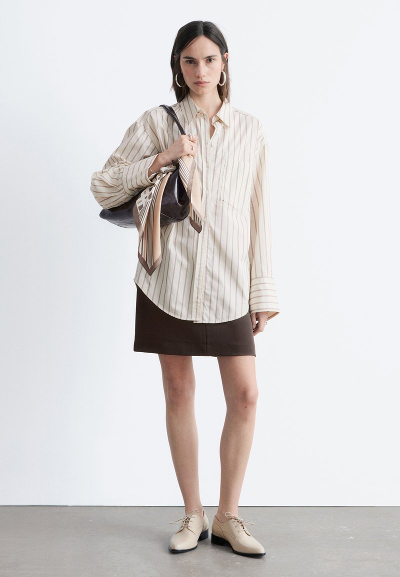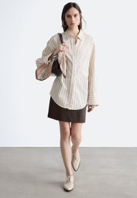 Mujer con camisa beige a rayas de gran tamaño, falda marrón oscuro, zapatos beige, sosteniendo un bolso de cuero oscuro con una bufanda estampada sobre fondo blanco.