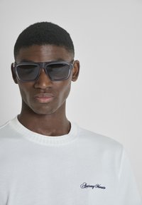 Hombre con camiseta blanca de manga corta con pequeño logo negro en el pecho, gafas de sol oscuras y pantalones oscuros sobre un fondo liso.