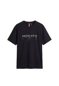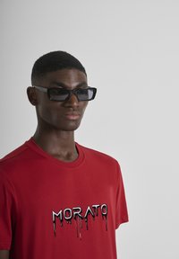 Hombre con gafas de sol negras rectangulares, camiseta roja con el texto "MORATO" goteando y pantalones plisados gris claro, de pie frente a un fondo blanco.