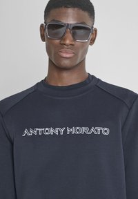 Hombre con sudadera y pantalones azul marino oscuro, gafas de sol, con el logo "ANTONY MORATO" en la parte delantera de la sudadera, posando frente a un fondo liso.