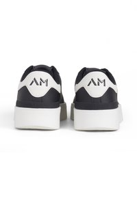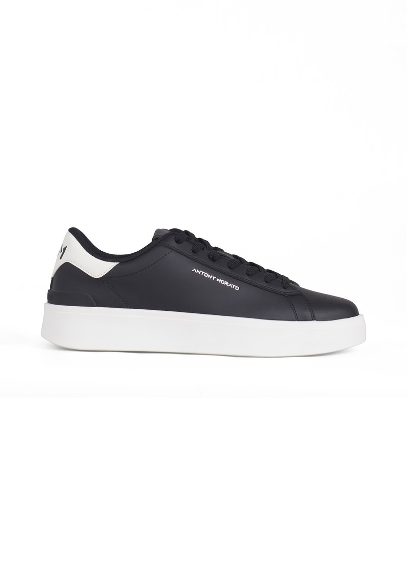 Zapatilla negra de corte bajo con suela blanca y parche en el talón, diseño con cordones y logotipo "Antony Morato" en el lateral.