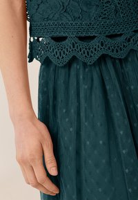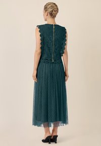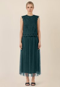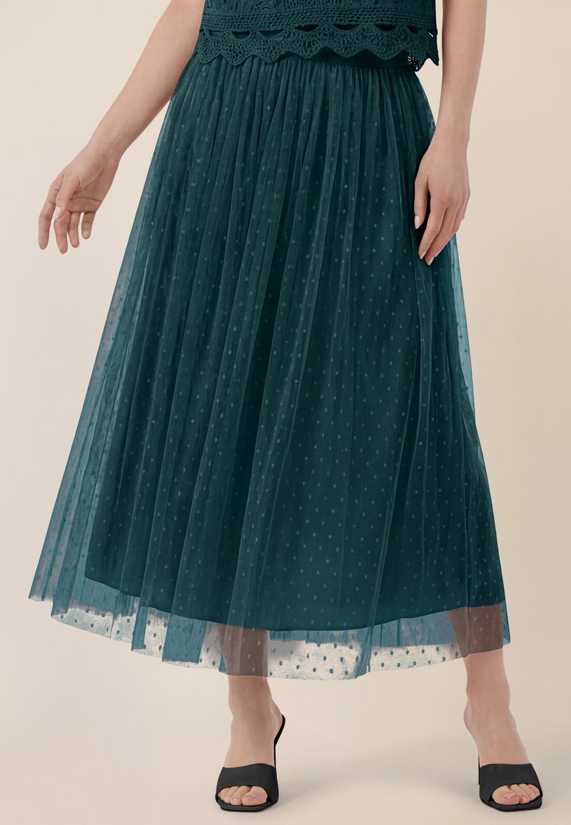 Mujer con falda midi transparente de lunares color verde oscuro con pliegues, combinada con sandalias negras abiertas de dedo, de pie sobre un fondo beige.