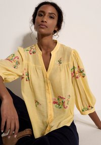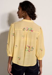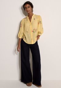 Mujer con blusa amarilla holgada de mangas tres cuartos y bordado floral colorido, combinada con pantalones oscuros sobre un fondo liso.