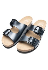 Sandalia negra tipo chancla con dos correas ajustables con hebillas, plantilla de corcho y suela de goma negra, mostrada de perfil sobre fondo blanco.