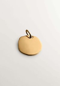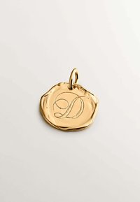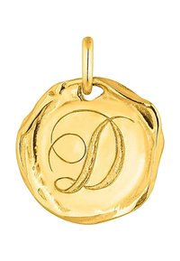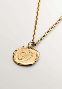 Collar de pendiente de oro con un diseño embutido, suspendido de una fina cadena, descansando sobre una blusa de encaje negro.