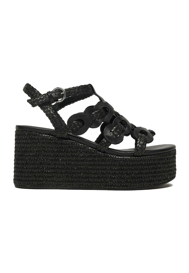 Sandalia de cuña plataforma negra con tiras trenzadas, adornos circulares de cuero y cierre de hebilla ajustable.