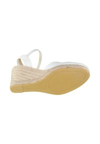 Zapato alpargata de cuña blanca con correa en el tobillo y hebilla, suela de yute trenzado, punta cerrada y material superior liso.