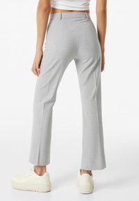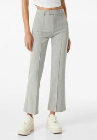 Mujer con pantalones de pierna ancha de talle alto en color gris claro con pliegues frontales y zapatillas blancas con plataforma, de pie contra un fondo blanco.