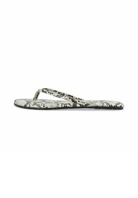 Sandalia de dedo plateada con correas finas, suela plana y superficie texturizada; diseño minimalista sobre un fondo blanco.