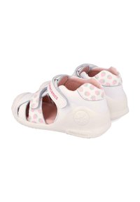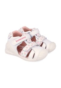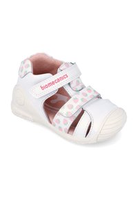 Sandalia blanca para niño pequeño con estampado de fresas rosas, suela de goma y correas ajustables de Velcro con la marca "biomecanics".