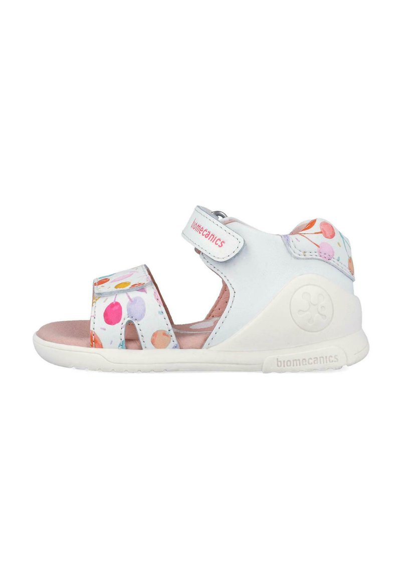 Sandalia blanca para niños con patrones coloridos de cerezas, dos correas ajustables, suela acolchada y la marca "biomecanics" en el talón y en la correa.
