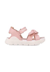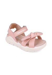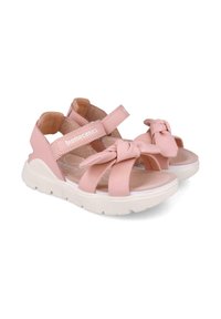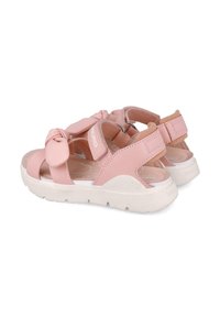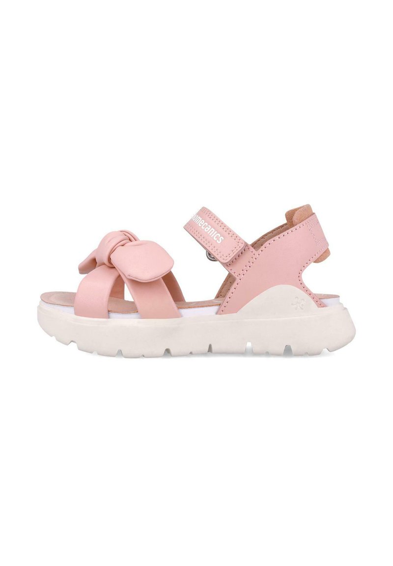 Sandalias de cuero rosa con detalle de lazo, correa ajustable, suela de goma blanca y plantilla acolchada. Diseño de puntera redonda y talón recortado.