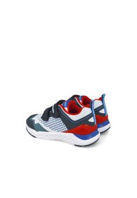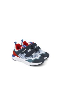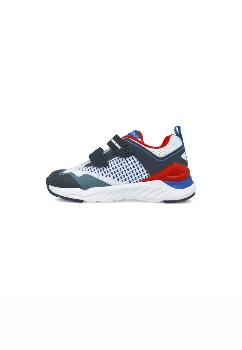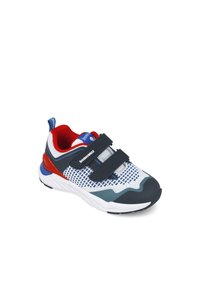 Zapatilla deportiva con una parte superior de malla blanca y acentos en azul y rojo, dos correas de velcro negras y una suela texturizada para mayor agarre.