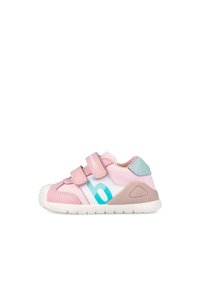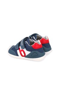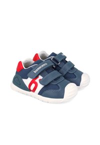 Zapatilla para niño pequeño en azul marino y blanco con detalles en rojo, dos correas de velcro y suela blanca, vista lateral.