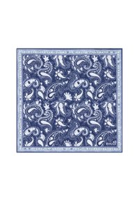 Pañuelo con estampado paisley en tonos beige y marrón, con acentos florales y borde de lunares, etiquetado con "Boggi Milano" en la esquina.