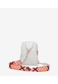 Mochila de cuero blanco con una parte superior redondeada, cierre de cremallera y una correa naranja con estampado que presenta acentos rosas. Detalle de hardware dorado en la cremallera.