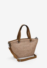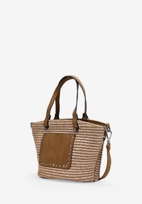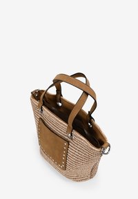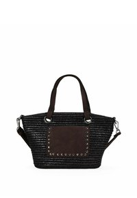 Bolso tejido de paja con dos asas de cuero marrón, un bolsillo delantero de cuero adornado con tachuelas metálicas y una correa de hombro desmontable.