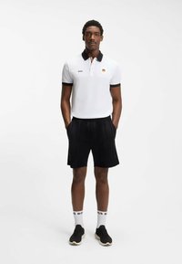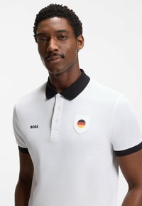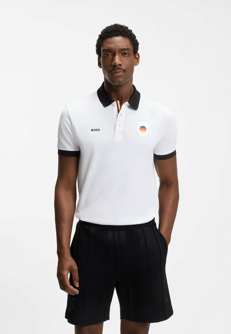 Hombre con camisa polo blanca con cuello negro y emblema de la bandera alemana, acompañado de pantalones cortos negros, de pie contra un fondo liso.