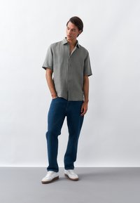Joven con cabello oscuro que lleva una camisa de manga corta color verde oliva abotonada y jeans azules, de pie con las manos detrás de la espalda.