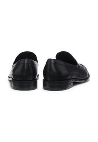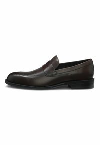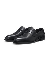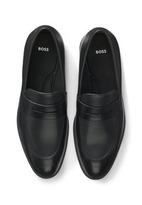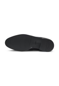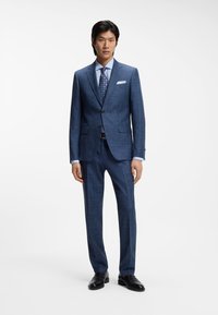 Hombre de pie con traje azul a medida con un sutil patrón de cuadros, camisa azul clara, corbata azul estampada, pañuelo blanco en el bolsillo y zapatos de vestir negros.