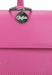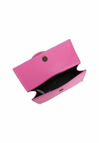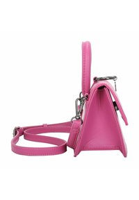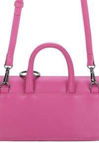 Bolso de piel rosa con un diseño estructurado, asa superior, correa desmontable, acento metálico con logotipo y detalles de costura a lo largo de los bordes.