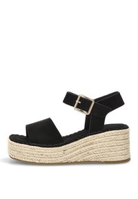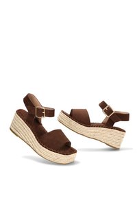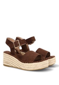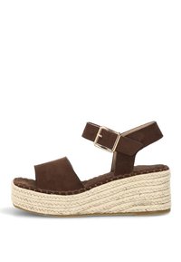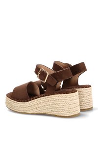 Sandalia de cuña de ante marrón con correa en el tobillo y hebilla dorada, con plataforma de yute trenzado.