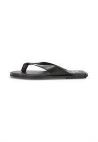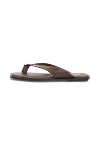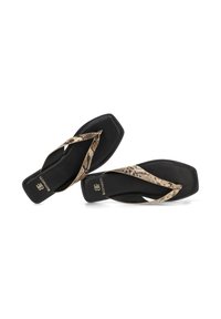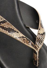 Sandalia plana negra tipo chancla con tiras estampadas de serpiente en tonos marrón y beige y diseño de punta cuadrada, vista lateral sobre fondo blanco.