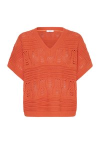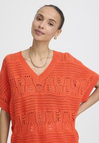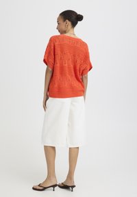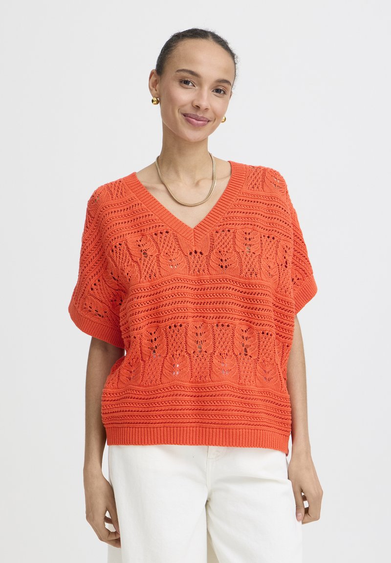 Mujer sonriente con pendientes de aro dorados y collar, camiseta naranja de punto con cuello en V y pantalones blancos sobre un fondo claro y sencillo.
