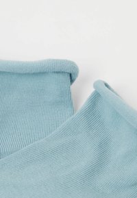 Piernas con calcetines tobilleros azul claro, con un pie ligeramente levantado y el otro apoyado en un fondo claro.