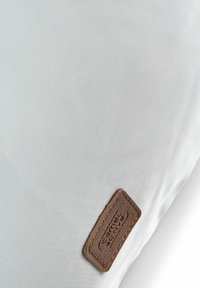 Bolso bandolera gris claro con correa ajustable, cierre con doble cremallera y pequeños parches marrones como acento sobre fondo blanco.