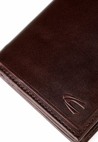 Cartera bifold de cuero marrón oscuro con costuras visibles y un pequeño logotipo en relieve en la esquina inferior derecha.