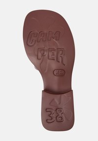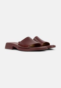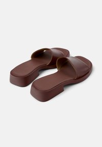 Sandalias tipo slide de cuero marrón con una correa ancha y un tacón bajo de bloque. Textura lisa y diseño minimalista que ofrecen un aspecto moderno.