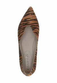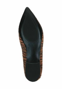 Zapato plano de punta puntiaguda en tela marrón con un patrón de rayas de tigre. Cuenta con un tacón bajo negro y un forro interior liso beige.
