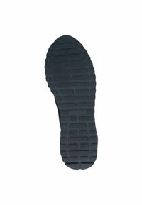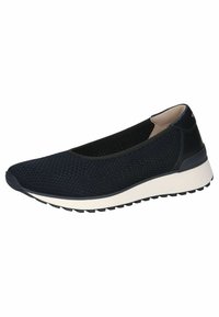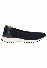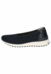 Zapato tipo slip-on de malla azul marino con detalles de cuero negro, entresuela blanca y suela de goma texturizada. Diseño elegante con tejido transpirable.
