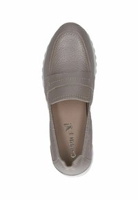 Zapato gris de cuero sin cordones con superficie texturizada, puntera redonda y suela de goma blanca contrastante. Diseño minimalista sin patrones destacados.